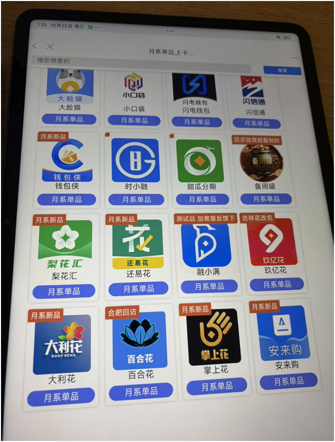 在“E卡之家—月系单品”路径下,该平台提供了十余款月系融担产品的链接。平台客服透露,此前曾上线蓝海易花、薪小用等多款月系融担产品,目前均已下架。