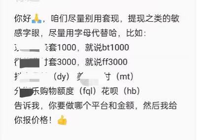 “咱们尽量不用套现这类敏感字眼哈,用字母替代。”一名中介对记者表示。在他发来的图片中,各类购物平台消费金融产品的代称、常见额度都已列好,等待“套现者”选择。在记者随机选择一类平台产品后,商家随后发来验证额度、套现方式的系列指引。