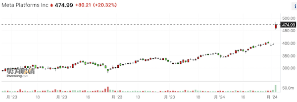 Meta因在去年四季度营收和利润超预期,并宣布首次分红后,开盘上涨约17%。2023年四季度的销售同比增长25%,费用下降8%,至237.3亿美元。每股收益为5.33美元,高于4.96美元,营收为401亿美元,高于391.8亿美元。每日活跃用户从208亿增至211亿。