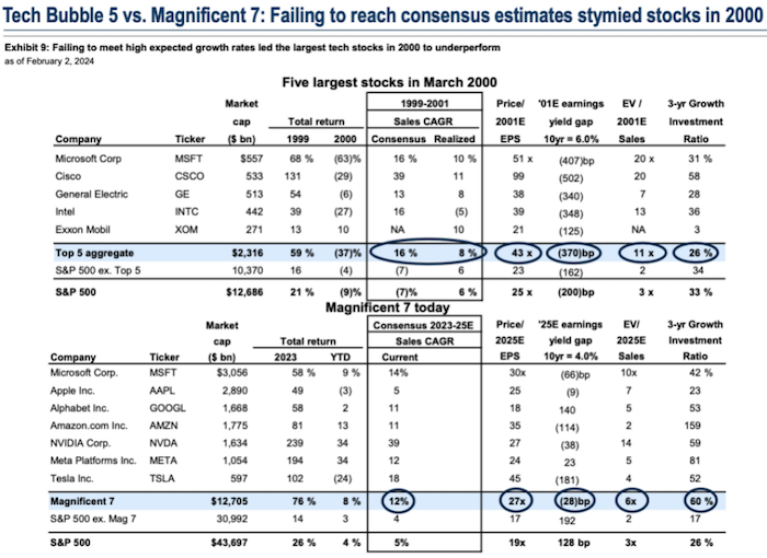 高盛研究显示,当时的科网泡沫主角主要是五家公司——微软、思科、通用电气、英特尔、埃克森美孚。它们在1999年的整体回报分别高达59%,当时它们的累计市值高达2.3万亿美元,而整体标普500剔除它们后市值也只为10.37万亿美元。当时,市场对五大巨头的3年(1999年~2001年)复合销售年化增速的预期为16%,但最终只实现8%,从而也导致后续泡沫破灭。