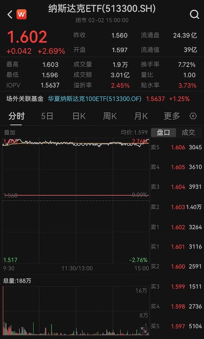 该ETF的溢价情况已经持续几日,某投资者在1月22日对记者表示,“我两周前买了一点美股ETF,今天(22日)早上看的时候涨8%~9%,但等下午收盘的时候已经涨了15%了,就好像加了杠杆一样。”当日,由于跨境ETF持续受资金追捧,美国50ETF午后快速拉升涨停,溢价率超10%,纳斯达克ETF(513300)涨3.54%。