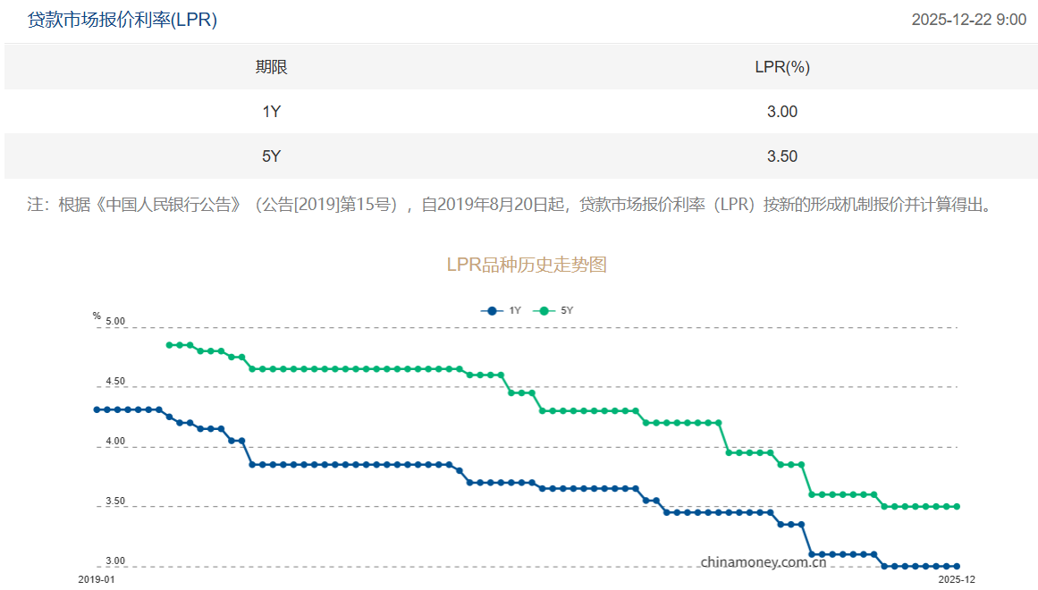 2025-12-22 09:04:30 【XM外汇跟单官网资讯】12月LPR报价出炉:5年期和1年期利率均维持不变 中国人民银行授权全国银行间同业拆借中心公布,2025年12月22日贷款市场报价利率(LPR)为:1年期LPR为3.0%,5年期以上LPR为3.5%。以上LPR在下一次发布LPR之前有效。