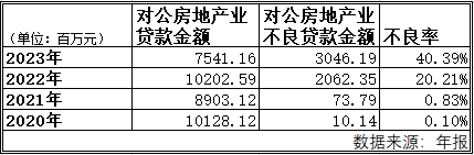 在2022年年报中,贵州银行称,主要是受个别房地产客户大额授信纳入不良影响,房地产贷款不良率较年初大幅增长19.38个百分点。当年,其对公房地产贷款余额为102.03亿元,占贷款总额的比例为3.48%,不良贷款金额为20.62亿元。