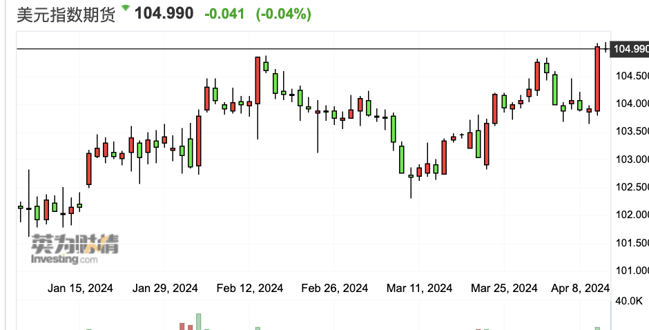 受此影响,美元指数期货也直线跳升,从103.8一举突破104,而后逼近105大关,美股大幅下挫。