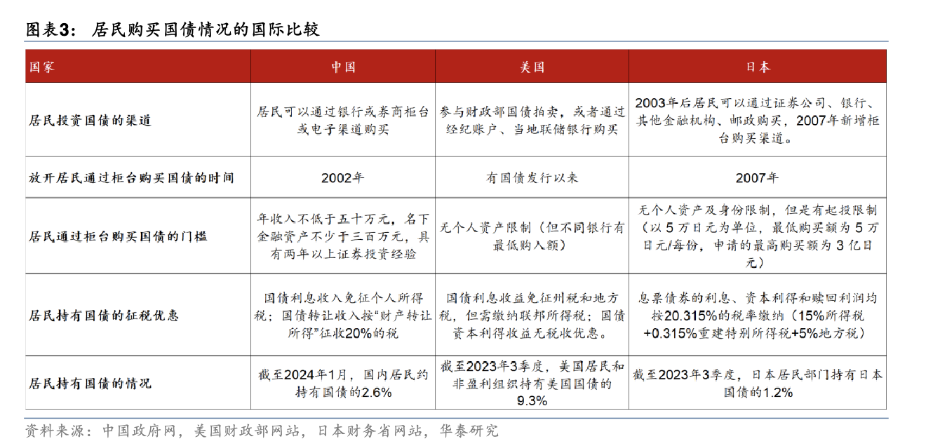 “放宽居民国债的柜台购买是拓宽居民投资渠道、加快发展多层次债券市场的重要方向。”华泰证券宏观分析师常慧丽在研报中表示,目前国内居民可以直接购买储蓄国债,但直接购买记账式国债的门槛较高。基于与美国、日本的对比分析,国内居民购买国债的品种和渠道均有拓宽空间。