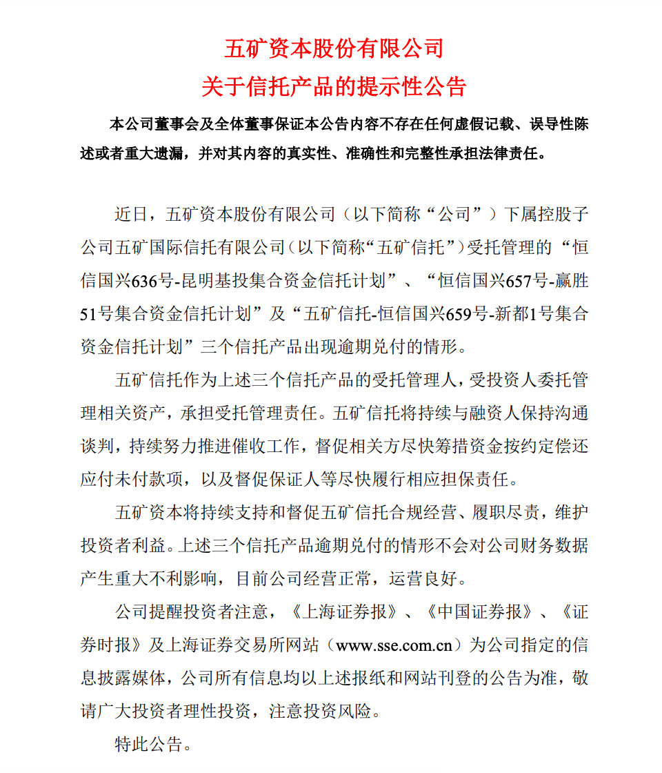 五矿资本称,近日,五矿信托受托管理的“恒信国兴636号-昆明基投集合资金信托计划”(下称“恒信国兴636号”)、“恒信国兴657号-赢胜51号集合资金信托计划”(下称“恒信国兴657号”)及“五矿信托-恒信国兴659号-新都1号集合资金信托计划”(下称“恒信国兴659”)三个信托产品出现逾期兑付的情形。