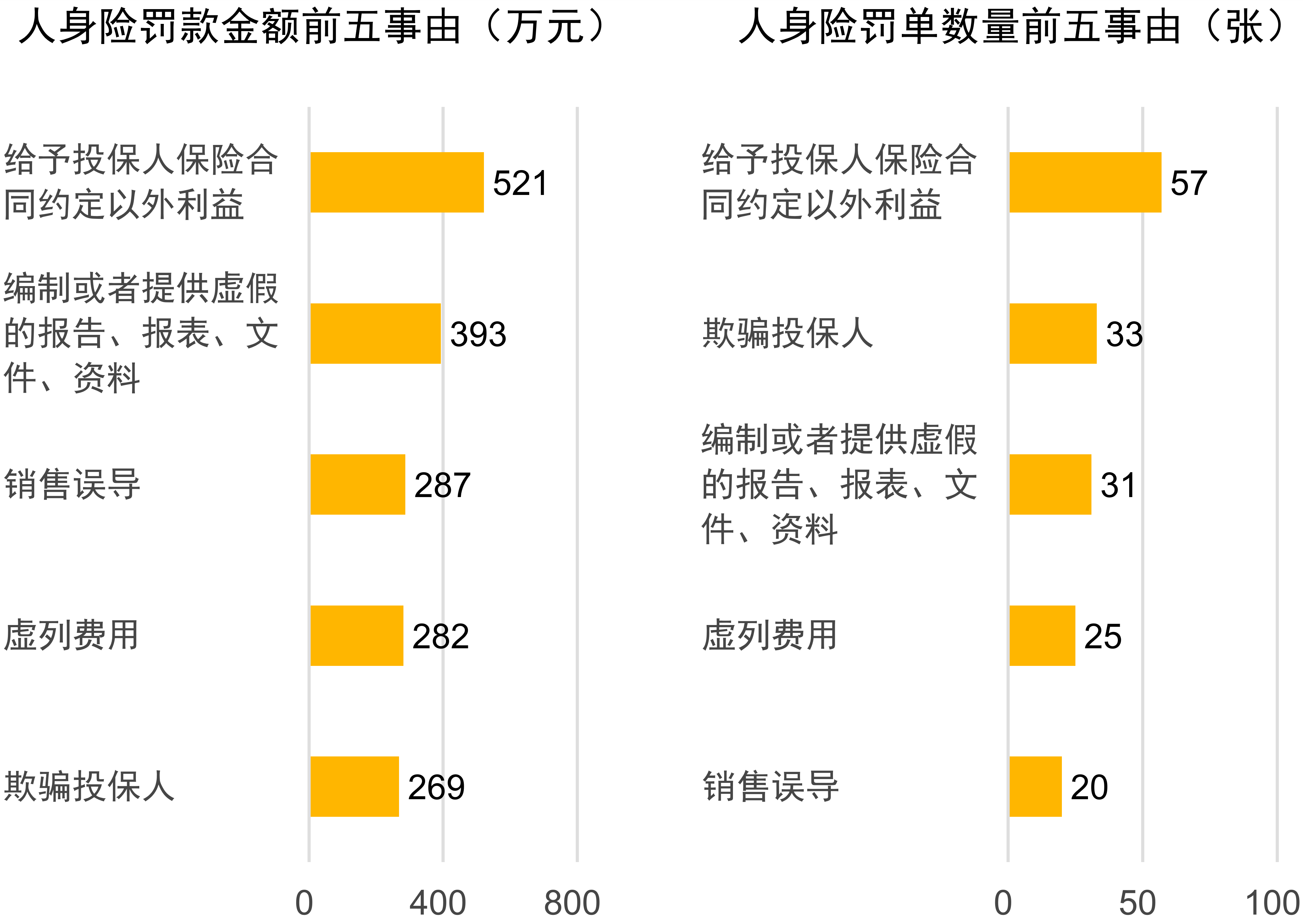 对于人身险公司而言,返佣这类“给予投保人保险合同约定以外利益”的问题一直是行业顽疾之一,第一季度的罚单也再次显示出了监管对此行为的重视,有57张罚单涉及该行为,罚款金额共计521万元,在人身险公司一季度罚单中不管是罚单数量还是处罚金额中均列首位。而在财产险中占据大半江山的车险多轮费改下也仍有“返现”现象不时发生,因此“给予投保人保险合同约定以外利益”也同样位列财产险公司第一季度罚单前五大事由中,有28张罚单涉及该问题,罚款金额共计557万元。