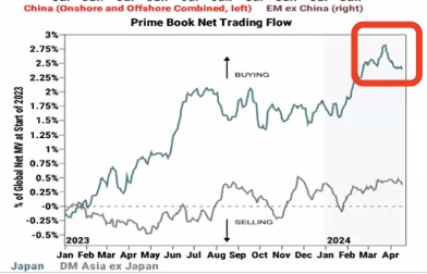 近期,国际资金回流中国股市,港股在上周出现罕见暴涨,恒生指数5天连涨8.6%,恒生科技指数连涨12.5%,涨幅颇为罕见,年内北向资金回流A股的金额已超去年全年。高盛认为,这一复苏得到了几个因素的支持——一季度宏观表现好于预期(部分机构开始上调2024年实际GDP增长预测)、“国家队”提供的“看跌期权”保护、2023年第四季度业绩较强、中美在外交和商业层面的接触广泛重启,以及“国九条”推出。
