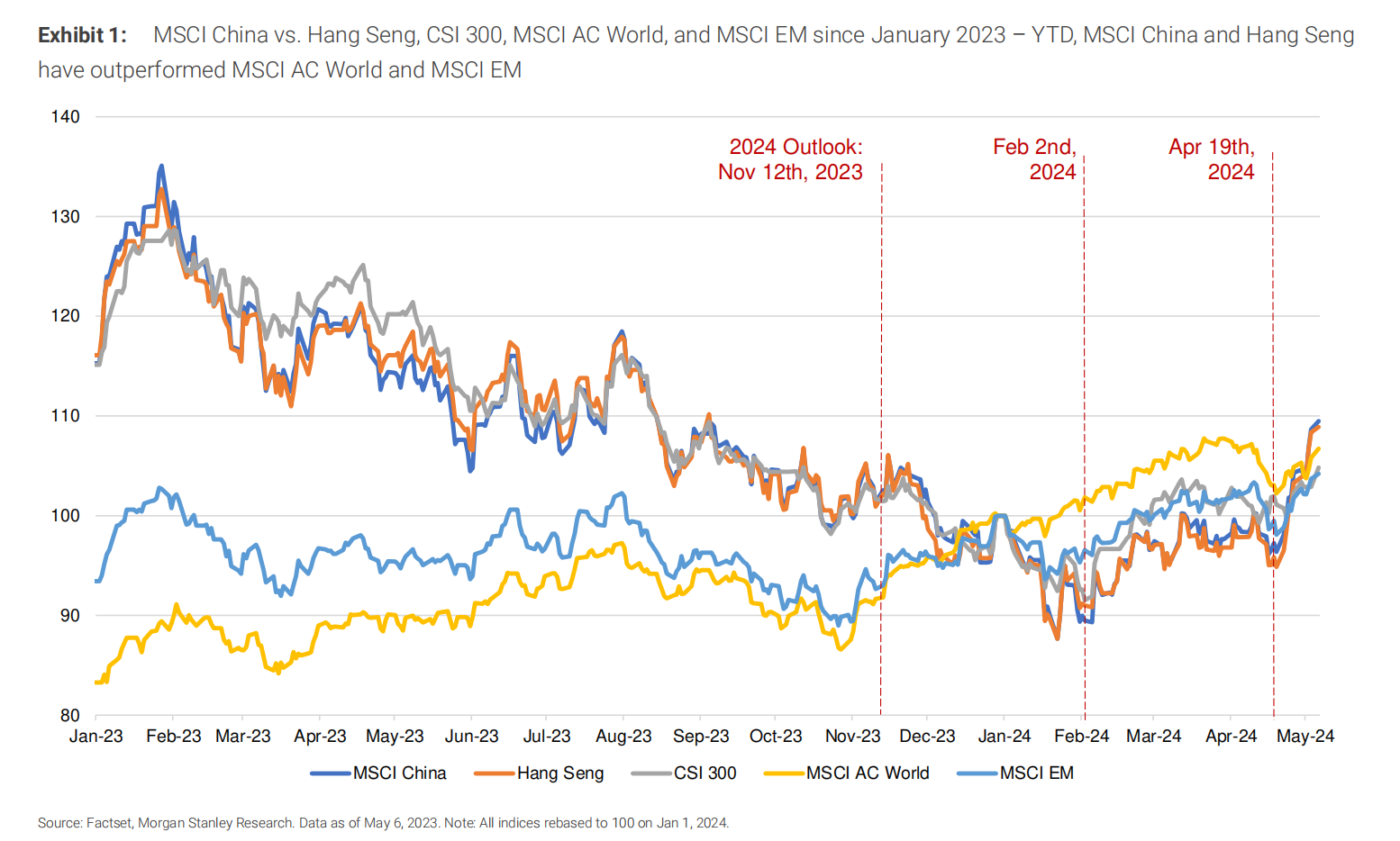 中国股市在最近一周和一个月的基础上是全球表现最佳的。MSCI中国指数(包括多数中国离岸市场成分股和小部分A股)的相对表现于2024年2月2日触底,并自那时起开始恢复,尤其是自4月19日以来,增长势头加速。