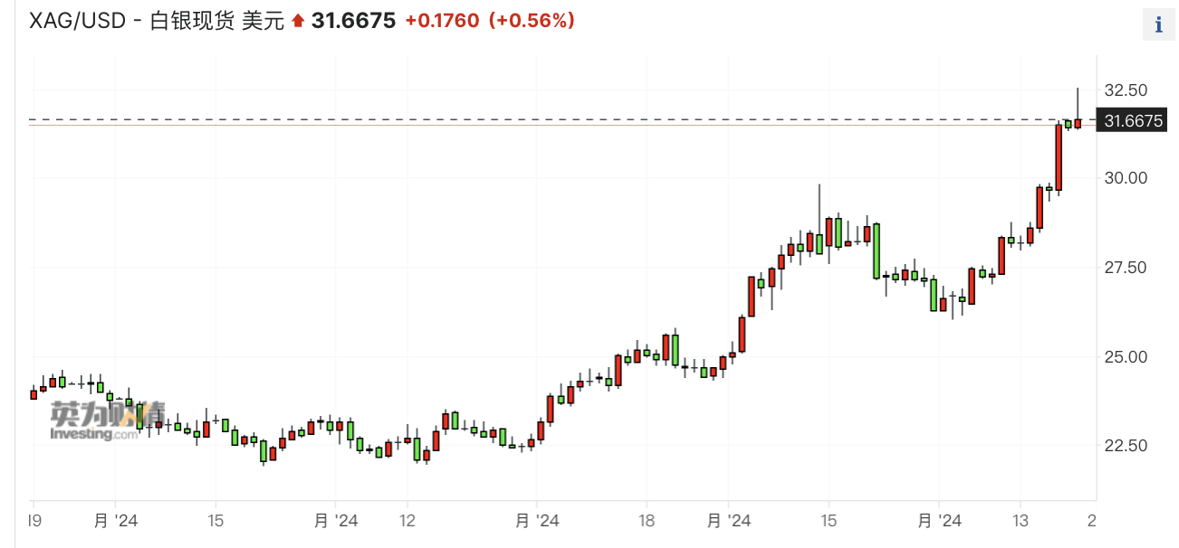 在国际金价走强的同时,白银价格表现也十分亮眼,贵金属上周集体爆发。白银大涨11.8%突破30美元/盎司关口,铂金涨8.7%收于1080美元/盎司。