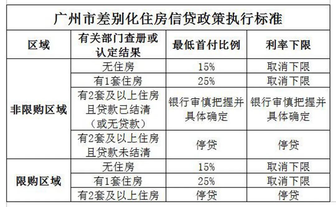 同时,第一财经从人民银行广东省分行获悉,同日,广东市场利率定价自律机制根据广州房地产市场形势变化及市政府调控要求,对广州市差别化住房信贷政策作出调整,包括首套房首付最低15%、二套最低25%,取消利率下限等。