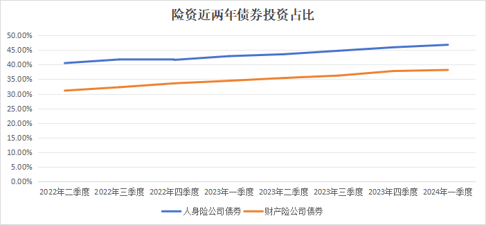 从险资一季度末的大类资产配置来看,不管是财产险公司还是人身险公司,近两年在股票和证券投资基金的配置上都有些许波动,但是对于债券投资,其投资占比则基本上是逐季递增,在一季度末分别达到38.2%及46.82%,创下近两年的新高。其中在人身险公司26.87万亿元的保险资金中,配置债券金额达到12.58万亿元,同比增长达21%;财产险公司的2.03万亿元保险资金中,债券金额则达7740亿元,同比增长14.81%。