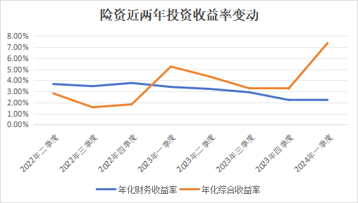 根据金融监管总局近日发布的一季度保险业资金运用情况表,险资一季度年化财务投资收益率为2.24%,与去年四季度基本持平。颇为亮眼的是,险企一季度的年化综合投资收益率高达7.36%,这是自2022年二季度监管定期披露保险资金运用季度情况以来的最高值。