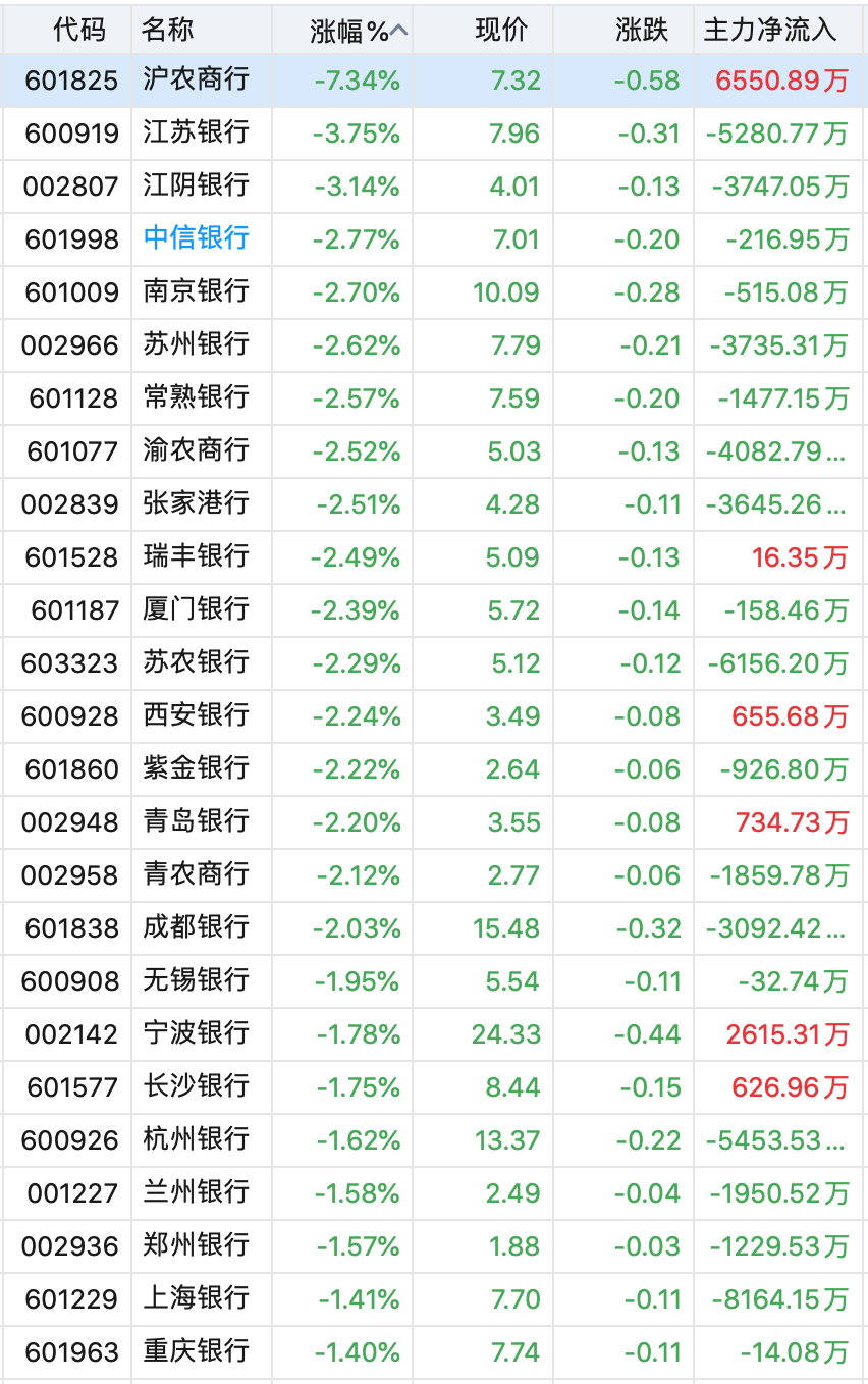 整体来看,周一银行板块跌幅靠前的25只个股中,除前期涨幅较大的股份行中信银行也跌2.77%外,其余均为城、农商行。42家A股上市银行中,当天仅交通银行、农业银行、建设银行、工商银行飘红。