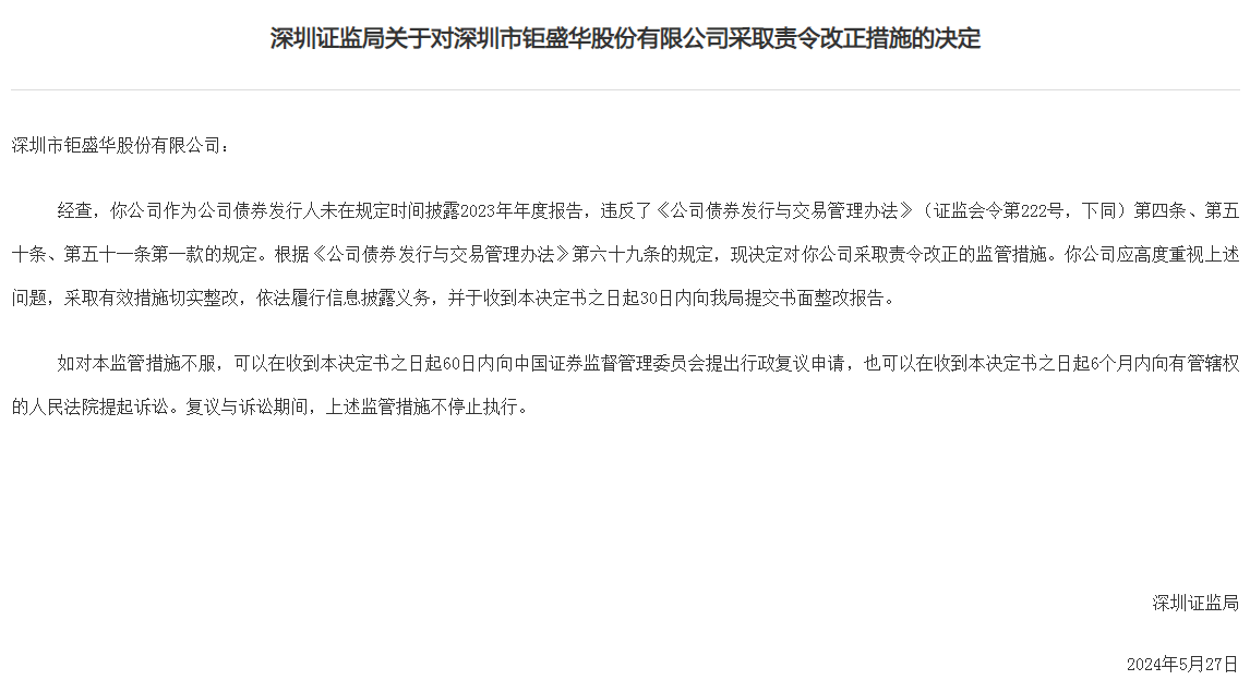 根据《公司债券发行与交易管理办法》第六十九条的规定,深圳证监局决定对钜盛华采取责令改正的监管措施。钜盛华应高度重视上述问题,采取有效措施切实整改,依法履行信息披露义务,并于收到本决定书之日起30日内向深圳证监局提交书面整改报告。