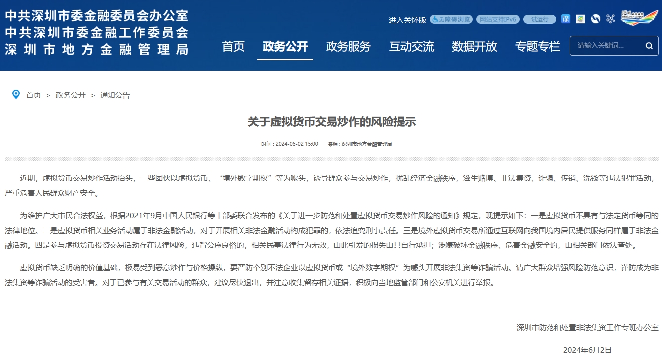 为维护广大市民合法权益,根据2021年9月中国人民银行等十部委联合发布的《关于进一步防范和处置虚拟货币交易炒作风险的通知》规定,现提示如下:一是虚拟货币不具有与法定货币等同的法律地位。二是虚拟货币相关业务活动属于非法金融活动,对于开展相关非法金融活动构成犯罪的,依法追究刑事责任。三是境外虚拟货币交易所通过互联网向我国境内居民提供服务同样属于非法金融活动。四是参与虚拟货币投资交易活动存在法律风险,违背公序良俗的,相关民事法律行为无效,由此引发的损失由其自行承担;涉嫌破坏金融秩序、危害金融安全的,由相关部门依法查处。