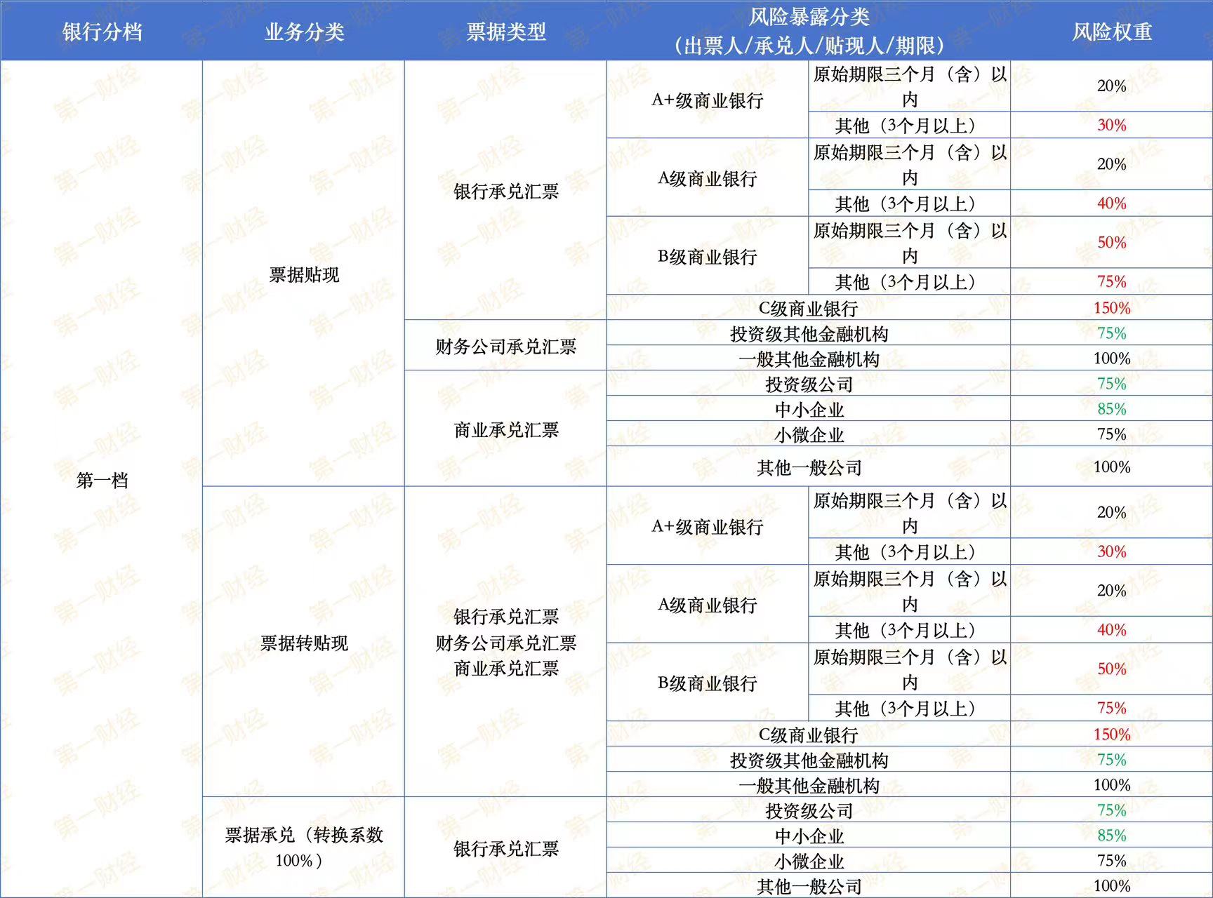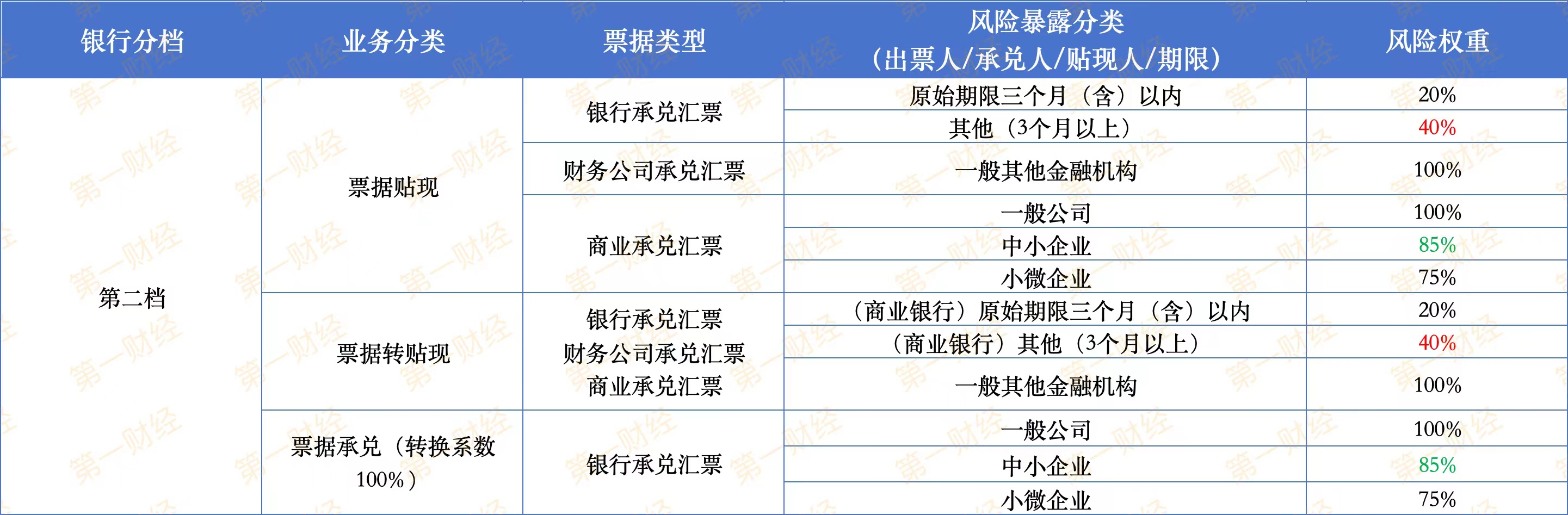 第二档商业银行不对交易对手商业银行划分级别,但原始期限3个月以上的票据业务风险权重由25%提升至40%。