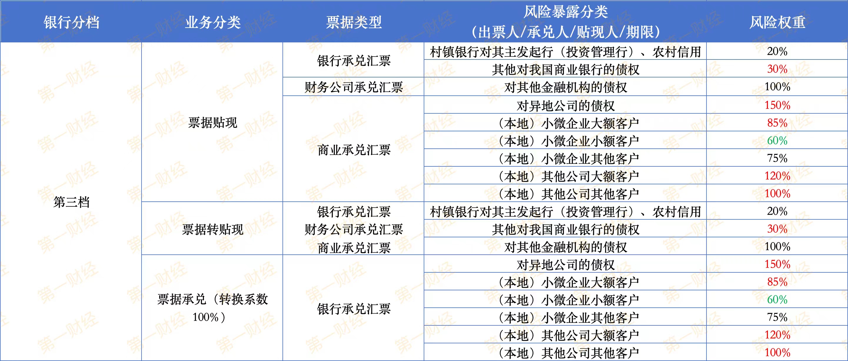 具体可以关注两方面,一是从贴现和转贴现业务来看,原始期限三个月以上的银票风险权重普遍提升;二是从承兑、贴现业务来看,第一、二档银行投资级企业、中小企业作为出票人的票据业务风险权重下降,第三档银行则对异地和大额客户的债权风险权重提升。