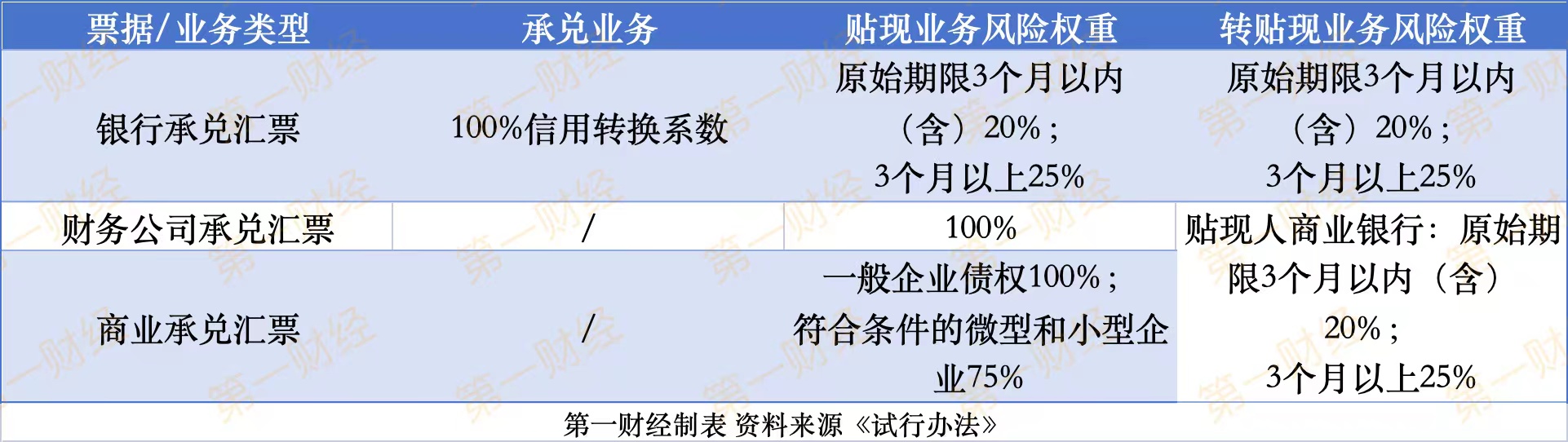 这也意味着,在现行规则下,所有商业银行的银票承兑业务按照100%信用转换系数转换为表内资产,按照对出票人债权的风险权重进行计量;贴现(直贴后持有)、转贴现(转贴现后持有)业务的风险权重按照不同承兑人/贴现人区分债权主体类型,以此计算风险权重。